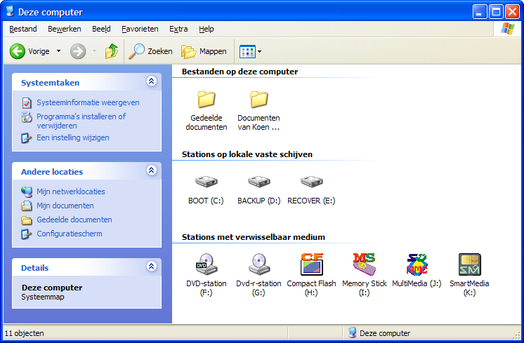In het 'Deze Computer' scherm vinden we naast de drie harddisk-partities en de twee DVD-drives ook de vier verschillende card-readers terug.