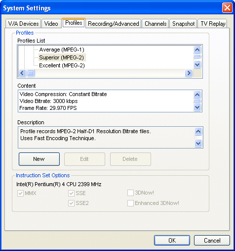 Tijd om te kijken hoe de Smart TV kan opnemen. Hiervoor kan alleen gebruik gemaakt worden van de binnen Power DVR geïnstalleerde codecs; eventuele codecs die Windows al kent, zoals in mijn geval bijvoorbeeld DivX en WMV kunnen niet gebruikt worden. Gelukkig zijn deze meegeleverde codecs niet de eerste de beste: je kunt er MPEG 1 en MPEG 2 bestanden mee aanmaken, zodat je je zelfgemaakte opnames kunt bewaren als (S)VCD of DVD als je beschikt over een CD- of DVD-brander.