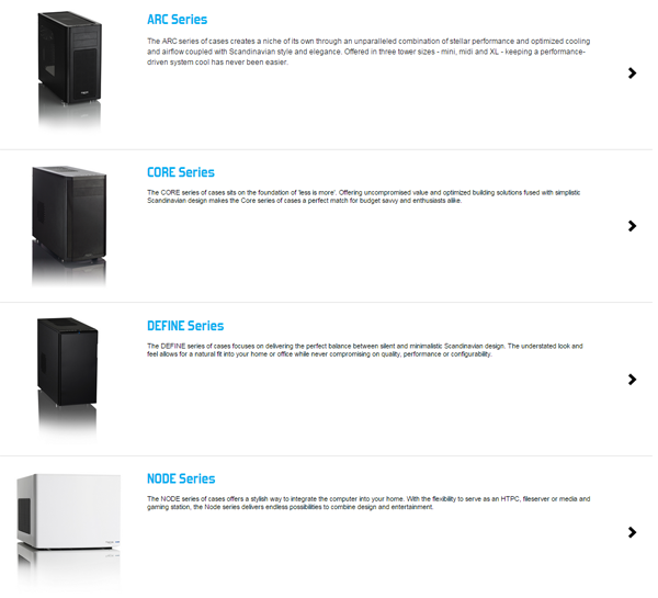 Als relatief klein bedrijf houdt Fractal Design het aantal productlijnen bij voorkeur overzichtelijk: naast de Define-modellen waarbij stilte voorop staat, is er een Core-serie en een Arc-serie behuizingen, met daarnaast nog een kleine aantal Node-modellen. Die laatste zijn eigenlijk een verzamelnaam voor ‘niche’-toepassingen (wat de naam, vrij vertaald ‘knooppunt’, enigszins verklaart): home-server, htpc en compacte pc. De Core-serie is vooral gericht op airflow en de Arc houdt een beetje het midden tussen Define en Core – intern vertonen ze veel overeenkomsten met de eerste, van buiten meer met de tweede. Daarnaast zijn de Core-modellen meer de ‘budget’-lijn, met een goede prijs/prestatieverhouding. Borggren geeft desgevraagd toe dat dat bij de recente, duurdere Core-kasten minder duidelijk is, die zijn eigenlijk qua prijs wat dicht bij de Arc en Define gekropen, een onbedoelde bijwerking van uitbreiding van de lijn. Borggren geeft zelf ook toe dat de goedkopere Core-modellen eigenlijk het interessantst zijn.