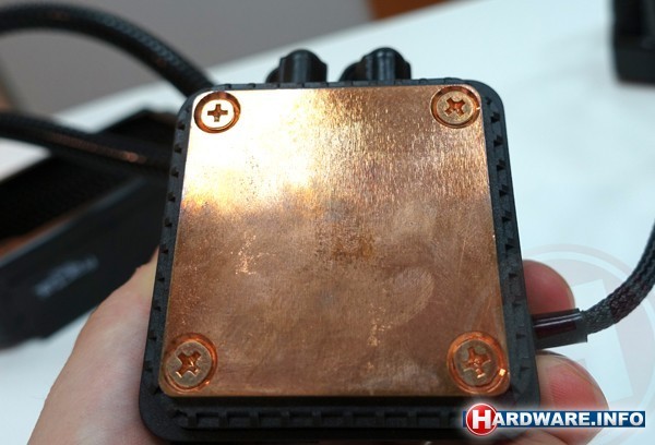 Bijzonder is de koperen plaat die contact maakt met de processor, de 'jetplate'. Deze is behoorlijk dik en intern voorzien van een door Fractal Design ontworpen profiel, dat de vloeistof zo effectief mogelijk door het blok moet laten lopen, om zo warmte zo goed mogelijk af te voeren. Het koper van deze plaat is niet gepolijst en ziet er al enigszins gekrast uit als je de koeler uit de verpakking haalt. Dat is, zeer nadrukkelijk, met opzet gedaan. Fractal heeft een koelpasta gekozen die optimaal moet samenwerken om de kleine krasjes op te vullen - krassen zijn volgens het bedrijf onvermijdelijk in het zachte materiaal en het beste contact ontstaat door de combinatie van koper met koelpasta. Of dat ook in de praktijk zo is, zal een test moeten uitwijzen.