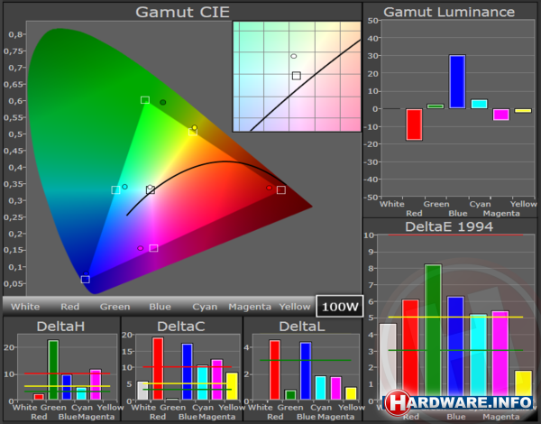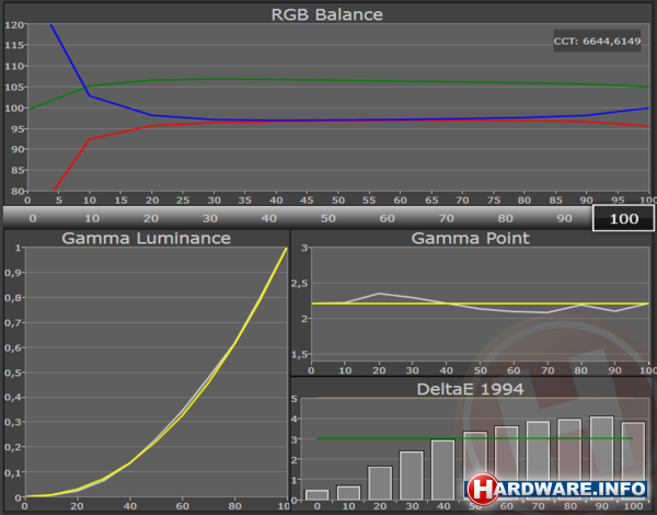 In het grijsverloop is goed te zien dat de basiskleuren stabiel verlopen van volledig zwart naar honderd procent wit en dicht op elkaar liggen. Hierdoor is er slechts een licht groene kleurzweem zichtbaar in grijsweergaven. De gammawaarde van deze drie samen heeft een lichte afwijking met 2,18. Die wordt veroorzaakt door kleine dalingen bij 70 en 90 procent wit, die worden gecompenseerd door een piek bij 20 procent wit. Dit zijn kleine afwijkingen die in de praktijk nauwelijks zichtbaar zijn. De ideale waarde voor de meest toepassingen is een gamma van 2,2.