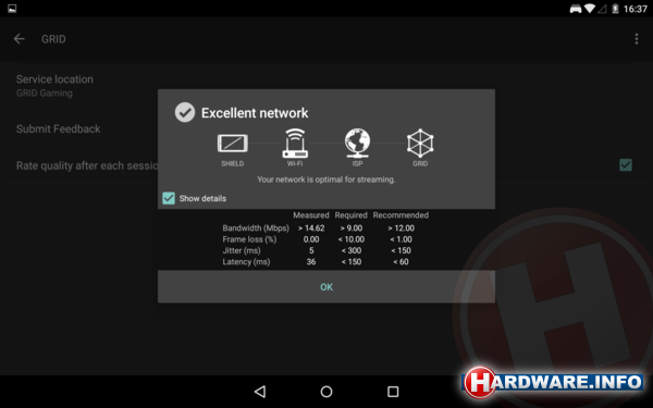 Je kunt je verbinding zelf zo vaak testen als je wilt door via de 'Settings'-knop naar het instellingenmenu van GRID. Je ziet daar de minimale en de aanbevolen instellingen van het netwerk. Dit werkt niet altijd even goed overigens. Toen we een verbinding probeerden te leggen via een access point dat alleen 2,4 GHz ondersteunt, kregen we de foutmelding dat de dienst nog niet beschikbaar was op onze locatie, terwijl die melding via een 5GHz-netwerk niet verscheen.
