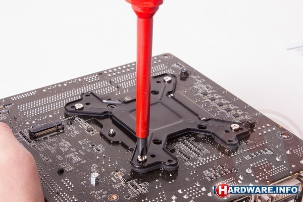 Schroef de backplate door het bord vast aan de CPU-koeler met de boutjes. Doe dit door eerst de schroeven tegenover elkaar deels vast te zetten. Heb je alle vier losjes bevestigd, draai ze daarna strakker aan, wederom steeds met de tegenover elkaar liggende schroeven.