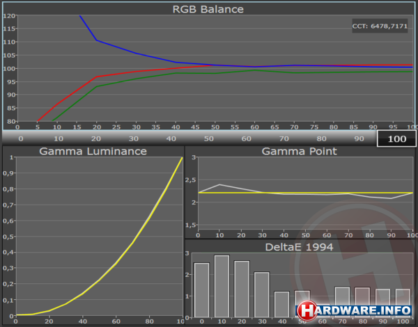De drie basiskleuren lopen in het begin een beetje uit elkaar, maar komen daarna al gauw netjes samen, waardoor er geen kleurzweem aanwezig is. Ook de gammawaarde van deze drie samen is erg mooi, met slechts twee kleine uitschieters bij 10 en 90 procent wit. Het totaalgamma is prima met 2,19. De gewenste gammawaarde is 2,20.