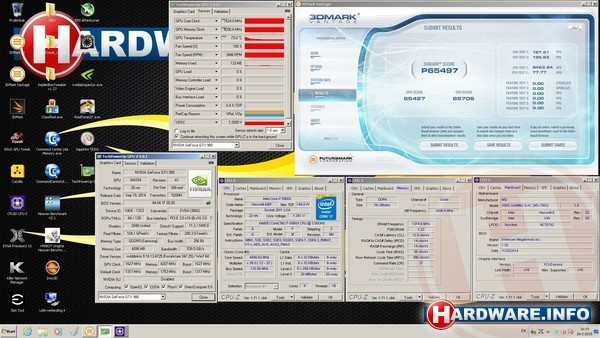 Uiteindelijk kregen we de GPU overklokt tot 1565 MHz en het geheugen tot 2153 MHz. Zoals te zien in onderstaande grafieken is dat hoger dan bij de eerder door ons geteste GTX 980 kaarten. Het resulteerde in een 3DMark Vantage score van 63973 punten, een 3DMark 11 score van 22155 punten en een 3DMark Fire Strike score van 14851 punten. Onder de grafieken vind je screenshot van onze overkloktests.