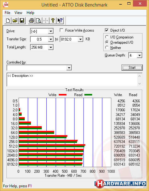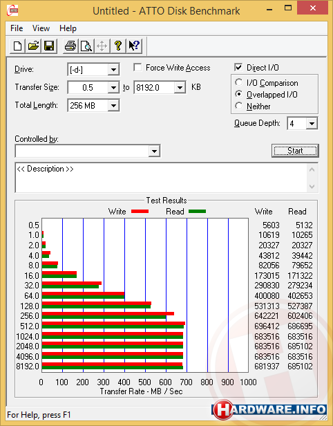 Allereerst hebben we de prestaties van de losse controller getest en vergeleken met de op dezelfde ASMedia chips gebaseerde onboard controller van het ASUS Z97-A/USB 3.1 moederbord. Hiertoe sloten we op beide controllers de in onze eerste USB 3.1 review getoonde externe exclosure met twee 840 Evo mSATA 500 GB SSD's aan. Zoals te zien zijn de resultaten vrijwel identiek en behalen we in beide gevallen in Crystal Disk Mark snelheden boven de 650 MB/s en in Atto snelheden ronde de 690 MB/s. Geen wonder ook, aangezien we natuurlijk met identieke controllerchips van doen hebben.