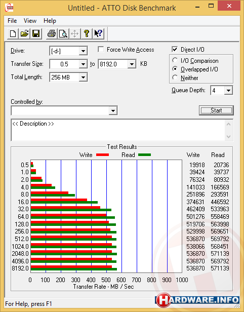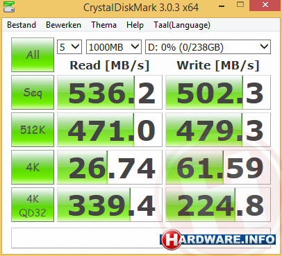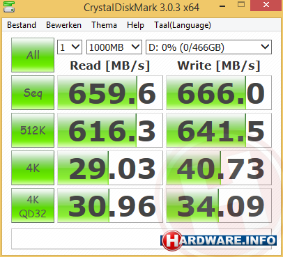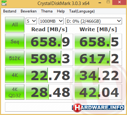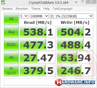 We behalen leessnelheden tot boven de 530 MB/s en schrijfsnelheden tot boven de 500 MB/s. Dat is met de snelste USB 3.0 geheugensticks en USB 3.0 externe SSD's bij lange na niet haalbaar.