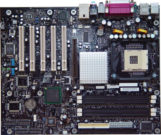Natuurlijk kunnen we het niet maken om het moederbord van de fabrikant van de chipset zelf niet te testen. Intel stuurde ons hiervoor het 865PERL moederbord. Wat we in een eerdere vergelijkingstest al eens gezegd hadden, blijkt nog steeds waar te zijn. Intel wil van zijn no-nonsense imago af door een moederbord te leveren dat wat betreft de uitrusting aansluit bij de concurrentie. Natuurlijk is dit bord voorzien van een 1 Gb netwerkaansluiting die via de CSA loopt. Ze kunnen het natuurlijk niet maken om een eigen product plaats te laten maken voor een concurrerend product, dat iets mindere specificaties heeft en niet veel goedkoper is. Maar de rest van de uitrusting mag er ook zijn. Vooral over het geluid is goed nagedacht. Intel maakt gebruikt van de ADI 1985 chip, met de reeds eerder besproken jack-sensing technology. Intel heeft hier tal van aansluitmogelijkheden voor op het backpanel geplaatst. Natuurlijk zien we op het backpanel de normale drie aansluitingen voor speakers, microfoon en koptelefoon. Net als ABIT heeft ook Intel er nog twee analoge aansluitingen naast gezet voor center/subwoofer en surround right/left, zodat je je koptelefoon- en microfoonaansluiting niet hoeft op te offeren om gebruik te kunnen maken van zeskanaals geluid. Als bonus heeft Intel, op de plaats waar normaal gesproken de tweede COM-poort zit, een coaxiale en optische digitale uitgang geplaatst. Naast de aansluitingen voor onboard sound, vinden we ook nog 4 USB 2.0 aansluitingen en een IEEE1394 aansluiting op het backpanel. Een implementatie van de PAT technologie vinden we bij Intel natuurlijk niet terug. Dat was ook absoluut niet te verwachten. Op BIOS gebied heeft Intel nog heel wat te leren. We vinden geen enkele manier om de processor te kunnen overklokken, maar dat is nog niet het grootste minpunt. Erger is dat, wanneer je bepaalde instellingen wilt veranderen in het BIOS, zoals bijvoorbeeld een boot-password, je eerst een jumper moet omzetten. Dat is toch echt niet meer van deze tijd. De doos die we van Intel kregen was geen retail doos. Het is dan ook niet bekend wat er in een retail verpakking meegeleverd wordt. We gaan er in ieder geval van uit dat er een handleiding in zal zitten. Aangezien in de verpakking die wij kregen ook nog twee SATA kabels waren meegeleverd, en een IDE en floppy kabel, kunnen we aannemen dat deze ook in de retailverpakking zullen zitten. Hetzelfde geldt voor de USB bracket met twee USB 2.0 aansluitingen. Helaas is er geen bracket meegeleverd met extra IEEE1394 aansluitingen.