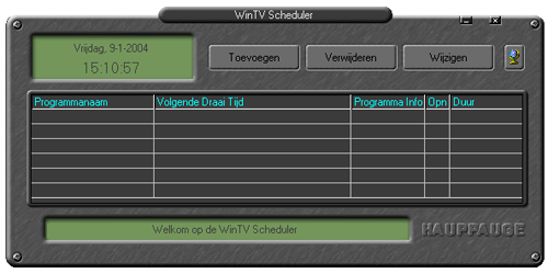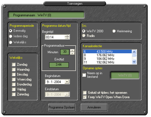 Met WinTV Scheduler kunnen opnames van tevoren worden ingeprogrammeerd. Dit kan eventueel herhaald worden op vast te stellen intervallen. De afbeelding hieronder laat zien dat de mogelijkheden niet onderdoen voor die van een analoge stand alone recorder.
