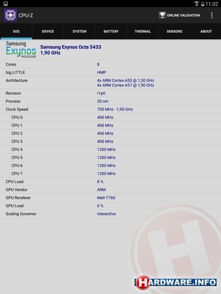 De Samsung Galaxy Tab S2 wordt aangedreven door een 64-bit-SoC uit de eigen fabrieken, namelijk de Exynos 7 Octa 5433. Dat is een model met in totaal acht rekenkernen. Vier Cortex-A57's geklokt op 1,9 GHz worden gecombineerd met vier Cortex-A53's geklokt op 1,3 GHz. De gpu is de Mali-T760, die is geklokt op 700 MHz en waarvan zes cores zijn ingeschakeld. Het werkgeheugen bedraagt 3 GB en de interne opslag 32 GB, waarvan ruim 25 GB overschiet na de eerste keer opstarten. Mocht dit niet genoeg zijn, dan kun je de opslag zoals gezegd nog uitbreiden middels microsd.