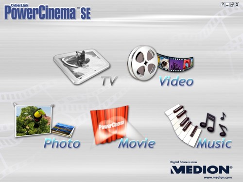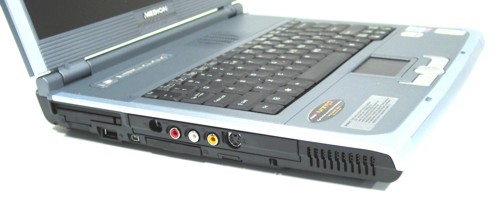 De rechterkant wordt verder nog gevuld met het slot voor de optische drive, die eenvoudig gewisseld kan worden met de TV-tuner. Een opvallende en slimme constructie, waarmee je de computer dus ombouwt tot een heus televisietoestel. Om de optische drive uit de behuizing te halen heeft Medion een aparte constructie bedacht: door op een verborgen hendeltje te drukken schiet een palletje naar buiten, waarmee je de drive uit de behuizing kunt trekken. Het nadeel is wel dat het palletje niet van de meest geweldige kwaliteit is, en dat het niet ondenkbaar is dat deze in het gebruik een keer afbreekt. Andere fabrikanten hebben voor het ontgrendelen van de optische schijf meestal een stevige schuif aan de onderzijde van de notebook aangebracht, waarmee je de optische schijf ontgrendelt. De TV-Tuner beschikt overigens over een kabel-aansluiting, een S-Video en composiet ingang en stereo ingang. Bij een TV-kaart hoort natuurlijk een afstandbediening en is dan ook door Medion meegeleverd. Om deze te kunnen gebruiken moet je wel de USB-ontvanger eerst op het notebook aansluiten. Die ontvanger wordt opgeborgen in een speciaal vakje in de afstandbediening. De afstandbediening werkt via radiosignalen: je hoeft dus niet op de ontvanger te richten om ervoor te zorgen dat het apparaat je opdracht begrijpt. De afstandbediening werkt alleen in combinatie met de zeer gebruiksvriendelijke PowerCinema software van CyberLink. Via grote duidelijke iconen word je de weg gewezen tussen televisie, foto's, muziek en digitale video. Deze software is door de grote iconen en letters ook prima te gebruiken als je het notebook via de TV-out op een televisietoestel hebt aangesloten.