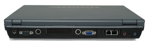 De achterkant is gevuld met de aansluiting voor de spanningsadapter, een seriële poort (!), PS/2, S-Video out, VGA-uit, 3 maal USB 2.0, modem, Ethernet, microfoon / bass, luidspreker back / line in en heel bijzonder voor een notebook een gecombineerde line-out / SP-DIF aansluiting. De onderzijde van dit notebook is weinig spannend. Het belangrijkste is dat de twee gevulde SO-DIMM slots makkelijk toegankelijk zijn via een groot paneel dat eenvoudig open te schroeven is. Ook de harde schijf is eenvoudig uit de kast te halen: deze bevindt zich in het midden achter de accu. Door een schroefje los te schroeven kun je de schijf uit de kast halen en indien nodig vervangen. Maar goed, dat zijn upgrades voor de toekomst. 512 MB werkgeheugen en 60 GB harde schijfruimte is voor de komende tijd ruimschoots voldoende.