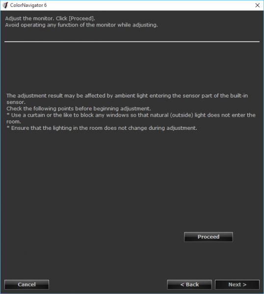 Voordat je de kalibratie start moet je er rekening mee houden dat invallend omgevingslicht de kalibratie kan beïnvloeden. De software waarschuwt daar ook voor (afbeelding 17). Buitenlicht is met name funest. De verlichting in de ruimte kan wel aanblijven, maar moet niet wijzigen tijdens de meting. Dit is ook de reden dat veel professionele monitoren, waaronder die van Eizo, voorzien zijn van een lichtkap. Voor normaal gebruik maakt het weinig uit, maar wanneer de kleuren echt 100% moeten kloppen, is het cruciaal dat omgevingslicht de weergave van het scherm niet beïnvloedt.