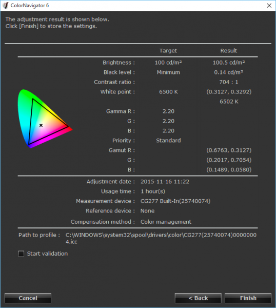 De kalibratie gaat verder automatisch: Color Navigator levert via USB het profiel aan de monitor aan, dat met behulp van de ingebouwde sensor en een reeks kleurvlakken de gewenste aanpassingen doet. Hiervoor wordt de ingebouwde LUT geconsulteerd, waarmee de uiteindelijke kleuren worden ingesteld. Na afsluiting van de kalibratie kan je de resultaten controleren (afbeelding 18).
