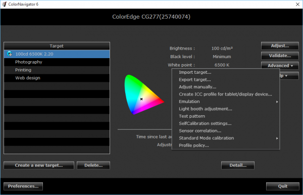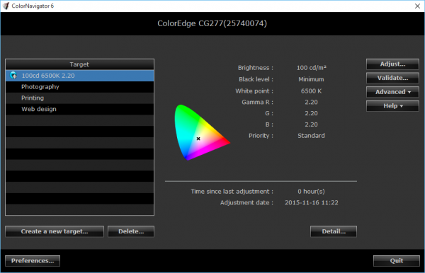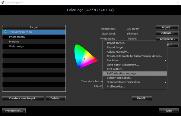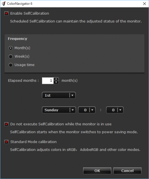 Op basis van het ICC-profiel kan je zelfkalibratie configureren (afbeeldingen 25-27), inplannen en opslaan in de monitor. Hiermee kan de monitor zichzelf met de ingebouwde sensor bijstellen, ook zonder dat de computer aan staat. Dit kan ook met ingebouwde profielen voor bijvoorbeeld Adobe RGB of sRGB. Uiteraard warmt de monitor eerst op voordat de kalibratie wordt uitgevoerd: pas dan is de weergave (kleurtemperatuur en helderheid) constant. Eizo raadt aan om beeldschermen iedere 200 uur opnieuw hardwarematig te kalibreren, en eens per jaar een nieuw ICC-profiel te maken.