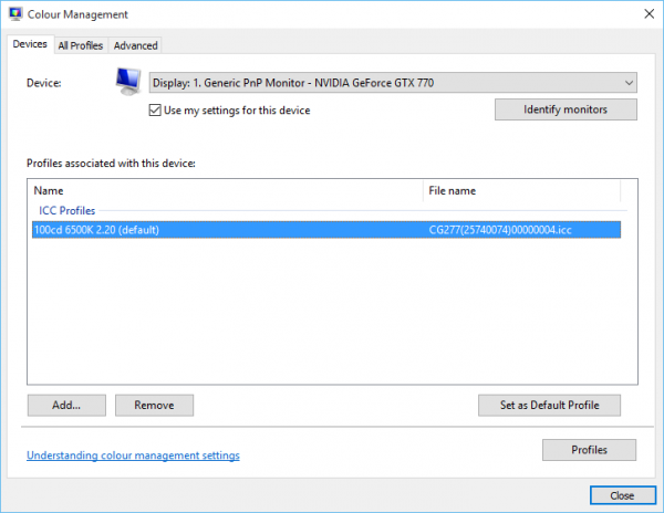 Na kalibratie is het in Color Navigator 6 aangemaakte profiel actief; in het kleurbeheer van Windows moet het juiste ICC-profiel geactiveerd zijn (afbeelding 28-29). Omdat de profielen in de monitor bewaard worden, zijn deze ook na opnieuw installeren van de software nog aanwezig, wat natuurlijk handig is.
