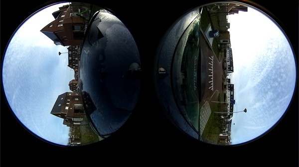 Zo zien video's eruit die de Ricoh Theta S exporteert. Het beeld van beide sensors is als losse 'bollen' naar elkaar geplaatst in een 1080p beeld.