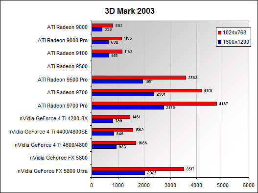 Wat meteen opvalt is dat de niet DirectX 9 compatible videokaarten (ATI Radeon 9000 / 9100 en nVidia GeForce 4 Ti) stukken lager presteren dan de wél DirectX 9 compatible videokaarten. Belangrijkste reden daarvoor is dat Game Test 4 bij niet DirectX 9 compatible videokaarten niet kan worden uitgevoerd, zodat de score nog maar op basis van de drie andere game tests bepaald kan worden. De hoogste scores worden behaald door de ATI Radeon 9700 Pro die met de standaard 3D Mark 2003 instellingen een score van 4767 behaalt. De Radeon 9700 Pro wordt op de voet gevolgd door de Radeon 9700 en Radeon 9500 Pro.