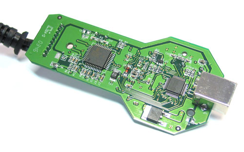 Met zo'n apart voorkomen konden we het niet nalaten dit apparaatje even open te schroeven. Binnenin treffen we een klein printplaatje. Hierop vinden we op een kant twee Philips chips, de SAA7113H (verantwoordelijk voor het converteren van het analoge signaal) en de ISP1501 (verantwoordelijk voor de high speed USB-verbinding). Draaien we het printplaatje om, dan zien we daar een derde chip. Er was een vergrootglas voor nodig om te ontcijferen wat voor chip dit is, maar het blijkt een Crescentec DC1100 chip te zijn, die het eigenlijk capture-werk verricht.