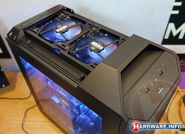 Bij de MasterCase 3 is het bovenpaneel weer net zo eenvoudig te verwijderen als bij de MasterCase 5. Hier zien we ook weer de kenmerkende handvaten. In dit geval is de bracket voor extra koeling bovenin gemonteerd. Dit is standaard aanwezig in de Pro-uitvoering.