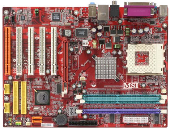 De KT880 borden van ASUS en MSI hebben veel gemeen. Beide borden hebben een AGP 8X slot en vijf PCI-sloten aan boord. ASUS biedt ruimte aan 4 DIMM's, MSI heeft echter maar drie geheugensloten aan boord. Dat laatste is wel een misser, want zodoende kun je in dual-channel modus slechts met twee geheugenmodules werken. Beide fabrikanten maken puur gebruik van de ATA-controllers binnen de VIA-chipset, wat het totale aantal Serial ATA en Parallel ATA aansluitingen in beide gevallen op twee brengt. Gigabit LAN mag natuurlijk niet meer ontbreken anno 2004: MSI maakt gebruik van de VIA VT6122 chip, ASUS heeft de bekende Marvel Yukon 88E8001 chip gebruikt. Beide borden hebben eveneens 5.1 kanaals audio, inclusief een S/P-DIF uitgang aan boord. MSI heeft wederom van een VIA-chip gebruik gemaakt, de VT1617, ASUS gebruikte de Analog Devidec AD1888. Beide zijn compatible met de AC'97 2.2. Prettig nieuws voor mensen die van een stille PC houden: de chipset is op beide borden passief gekoeld en zowel ASUS als MSI hebben een systeem aan boord om de snelheid van de CPU-koeler aan te passen aan de temperatuur.