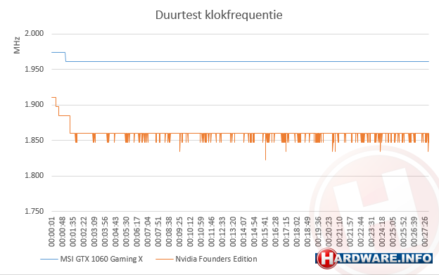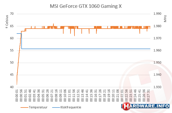 De kloksnelheid van de MSI GeForce GTX 1060 Gaming X zakt binnen een minuut iets minder dan 15 MHz terug, maar daarna houdt hij zijn klokfrequentie goed vast. De temperatuur blijft ook iets onder de 65 graden.