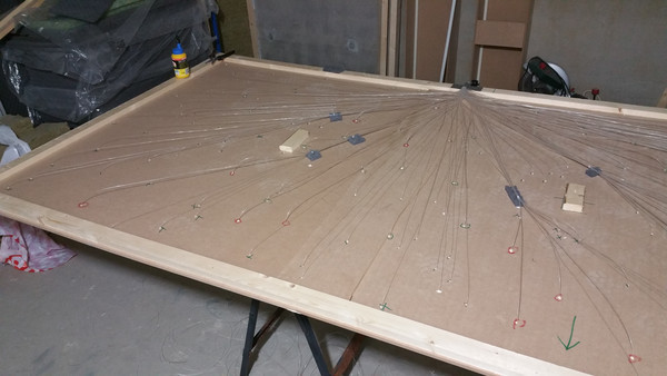 Vanaf de achterzijde steken we alle glasvezels door de geboorde gaten, en lijmen deze aan de houten platen vast...