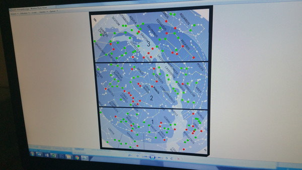 We verdelen een sterrenkaart over de drie plafonddelen en markeren met groen en rood de fellere sterren...