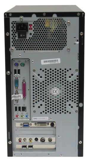 Als we de kast omdraaien dan zien we een flink aantal aansluitingen, vier USB 2.0 aansluitingen, 10/100 Ethernet, serieel, parallel, audio (5.1), VGA, DVI, S-Video out, Composiet en S-Video in, Audio-in (voor de TV-Tuner), TV-kabel in, Radio-kabel in en twee FireWire aansluitingen.