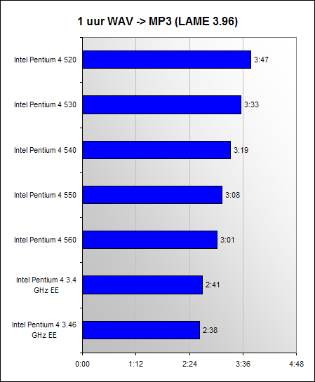 Bij het comprimeren van muziek naar MP3 met behulp van LAME lijkt de extra cache van de Extreme Edition processors erg welkom. Beide EE's verwerken het uur audio duidelijk sneller dan de reguliere Pentium 4's. Het verschil van 3 seconden tussen de 3.4 en 3.46 GHz EE's is echter wederom te verklaren door het verschil in klokfrequentie, niet door de snellere frontside bus.