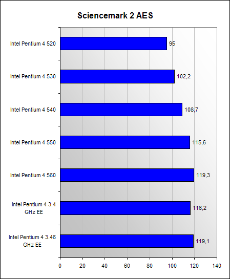 De data encryptie benchmark uit Sciencemark 2 staat bekend om het feit dat deze baat heeft bij een snelle verbinding tussen de processor en het geheugen. AMD Athlon 64 processors met geïntegreerde geheugencontroller presteren traditiegetrouw zodoende erg goed in deze benchmark. Het verschil tussen beide EE's is met 2.5% inderdaad wat hoger dan het pure verschil in kloksnelheid. Desalniettemin is de 3.6 GHz reguliere Pentium 4 toch nog de snelste.