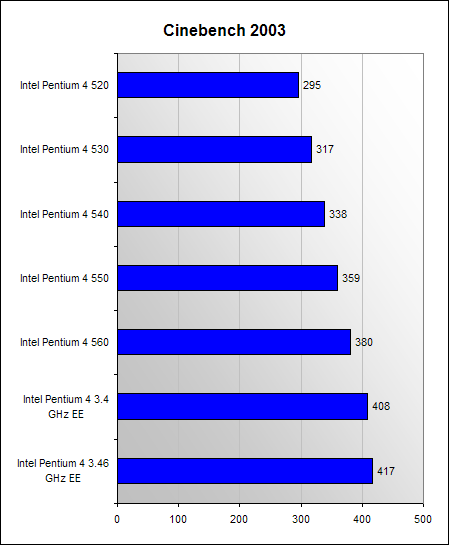 Als laatste kijken we naar de professionele 3D-rendering benchmark Cinebench 2003. Hier presteren de EE's dankzij de extra cache weer wat beter dan de normale Pentium 4's. Het onderlinge prestatieverschil van 2.2% tussen de twee EE's toont echter aan dat ook hier de nieuwe FSB niet voor wonderen kan zorgen.