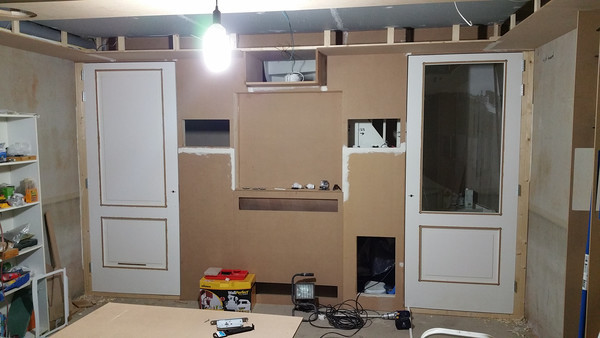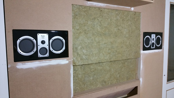 ...waarin uitsparingen worden gemaakt voor de twee surround-back luidsprekers en een subwoofer. De twee deuren worden ook nog voorzien van een extra laag MDF.