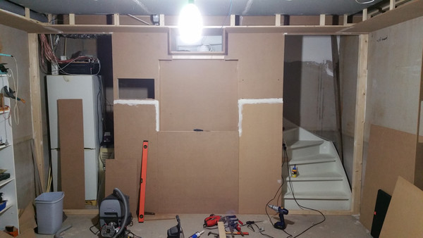 De wand wordt aan de voorzijde afgewerkt met MDF, terwijl we de ruimtes tussen de balken van het frame opvullen met glaswol en de achterzijde voorzien van een dubbele laag gipsplaten. Dit om de wand massa te geven, zodat deze minder snel gaat resoneren en beter in staat zal zijn om lage tonen richting de rest van het huis tegen te houden. Al naar gelang hoe de geluidsmetingen uiteindelijk uitvallen zullen we mogelijk ook extra steunbalken aan de achterzijde van de wand plaatsen, om zo nog meer stevigheid te bieden.