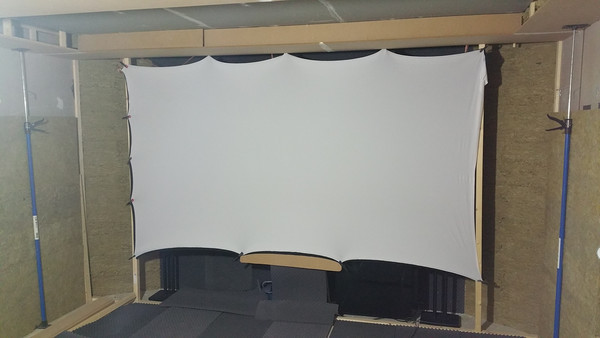 Om te zorgen dat het geluid toch (vrijwel) ongehinderd de ruimte in kan komen is het nodig om daarvoor een speciaal 'akoestisch transparant' scherm te gebruiken, ofwel een scherm dat gemaakt is van materiaal dat geluid doorlaat. Standaard projectieschermen zijn dat niet, maar er zijn speciale schermen te koop die ofwel voorzien zijn van duizenden minuscule gaatjes die geluid doorlaten, of gemaakt zijn van een vrij open geweven stof. Het nadeel van akoestische transparante schermen is echter dat deze behoorlijk prijzig zijn, voor een scherm van drie meter breed betaal je al snel 1500 euro. Aangezien dit een DIY project is, gingen we op zoek naar alternatieven en die vonden we al snel. Op AVSforum.com, een grote community van home theater liefhebbers, zijn lovende geluiden te horen over het gebruik van spandex of lycra stof voor het maken van akoestisch transparante schermen. Lycra, het materiaal waarvan badpakken gemaakt worden, is een glad geweven stof van elastaanvezels die zeer elastisch is en goed lucht doorlaat. Lycra is verkrijgbaar op anderhalve meter brede rol, en kost bij verschillende online shops ongeveer 12 euro per strekkende meter.