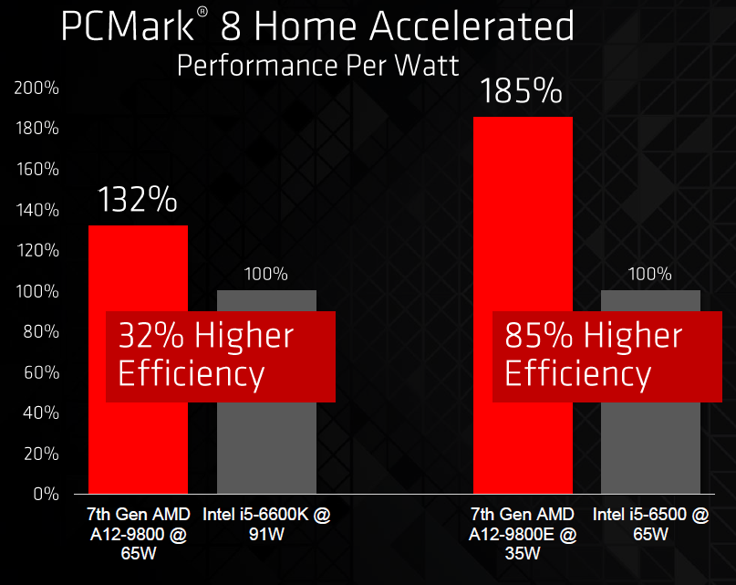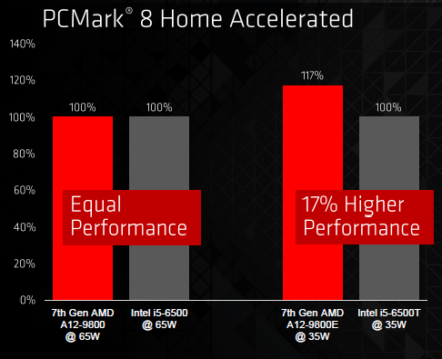 AMD maakt in enkele zelf uitgezochte GPU-zware benchmarks de vergelijking met Intel-processors. PCMark 8 Home Accelerated maakt bijvoorbeeld gebruik van OpenCL, waardoor de betere IGP in AMD-processors goed tot zijn recht komt (de volgende benchmarks zijn afkomstig van AMD zelf).