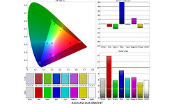 Bij de ASUS constateren we een veel te laag contrast (366:1), te wijten aan een veel te hoge zwartwaarde van 0,71 cd/m² (goed is 0,3 cd/m² of lager). Door de relatief hoge helderheid is het wel beter buiten bruikbaar dan de andere twee, zeker de HP. Van de drie is de kleurafwijking het minst slecht, maar een DeltaE van 7,9 levert nog altijd een met het blote oog zichtbare kleurfout op. De kleurtemperatuur is te hoog, boven de 7000K, waardoor een zichtbaar blauwzweem aanwezig is, terwijl het gamma met 1,83 veel te hoog is en details in lichte schermdelen wegvallen. Kijkend naar de kleurendriehoek zien we dat alle kleuren veel te ver naar binnen liggen, waardoor de kleuren onderverzadigd en grauw ogen. Dat is zeker bij rood en groen storend zichtbaar.
