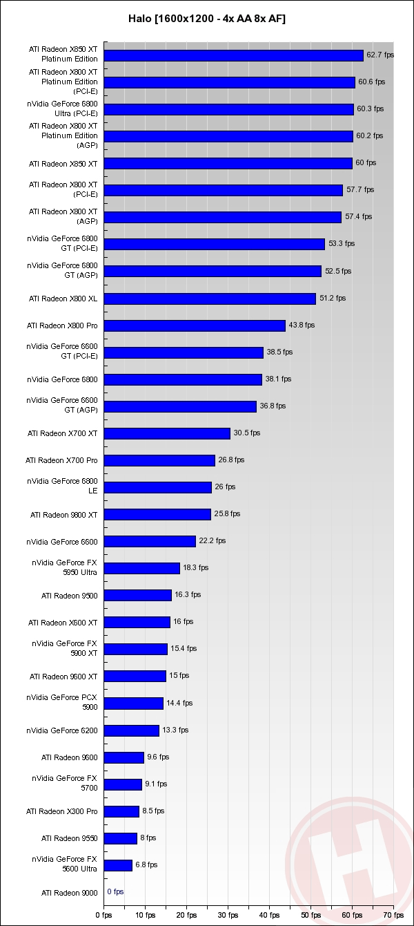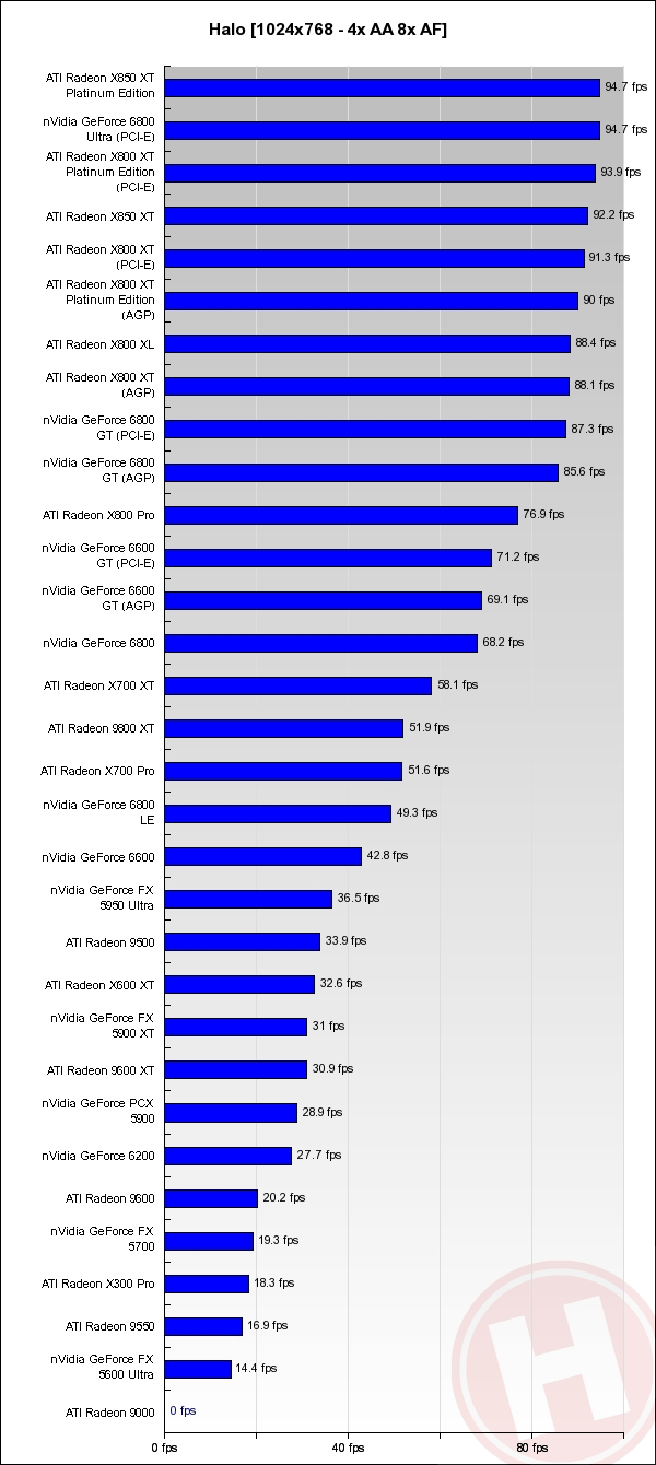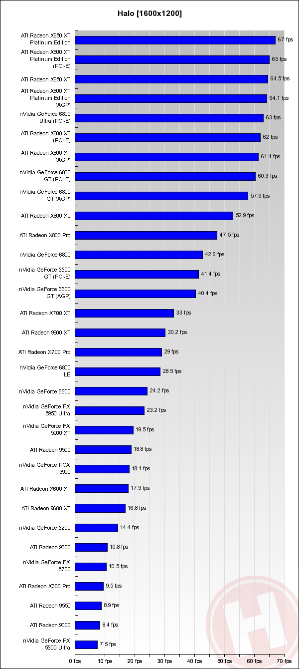 In Halo kunnen we wederom dezelfde conclusie trekken: de Radeon X850 XT PE gaat aan kop in de benchmarks, maar op de voet gevolgd door de 6800 Ultra. De prestaties van de nieuwe X800 XL liggen wederom tussen die van de X800 Pro en X800 XT.