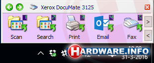 De laatste scanner die we bespreken is de senior van het gezelschap, de Xerox DocuMate 3125. Hij ziet er ook wat gedateerd uit vergeleken met de meeste andere modellen in deze test. Toch heeft hij een klein gesegmenteerd schermpje. Met de twee pijltjestoetsen ernaast kun je daar een door jezelf geconfigureerd profiel kiezen. Ook hier heb je er weer maximaal negen tot je beschikking. Nadat je het profiel hebt gekozen, kun je eronder met een druk op de Simplex- of de Duplex-knop een enkelzijdige of dubbelzijdige scanopdracht starten. Doe je dit liever vanaf een via usb aangesloten computer, dan kan dit ook. Xerox voert het aanbieden van de scanmogelijkheden in het systeemvak het verst door van alle fabrikanten in deze test. Als je links klikt op het One Touch-icoon in het systeemvak, komt er een balk tevoorschijn met de negen ingestelde profielen. Deze balk blijft daar staan nadat je het commando hebt gegeven. Handig als je meerdere scans achter elkaar wilt maken, of gewoon graag continu de snelkoppelingen bij de hand wil hebben.