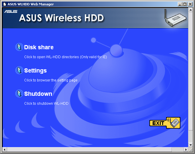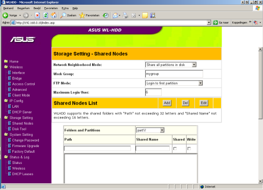 Natuurlijk biedt de WL-HDD meer functionaliteit dan alleen een access point en router. Zoals al gezegd kun je er een 2,5 inch notebook harddisk in bouwen om deze vervolgens via het netwerk te benaderen. Ga je met je browser naar de website van de WL-HDD, dan zul je de webmanager van de onderstaande afbeelding aantreffen.