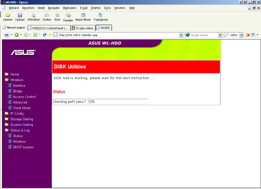 Omdat je de harde schijf bezwaarlijk voor elk onderhoud uit de WL-HDD kunt halen, heeft ASUS in de webinterface een aantal disk tools opgenomen. De eerste tool is file system check. Uiteraard is het ook mogelijk om verschillende partities (of de gehele harde schijf) te formatteren en zelfs om je eigen partities aan te maken. Dit laatste gaat helaas niet zonder gegevens verlies, dus zorg ervoor dat je de juiste partities gemaakt hebt voordat je de harde schijf gaat vullen!