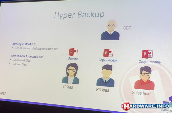 Via Hyper Backup kun je ook een backup maken naar een andere NAS. Daarbij is het nu mogelijk om gebruik te maken van intelligente deduplicatie. Dat betekent dat een bestand dat meerdere keren is opgeslagen onder verschillende namen maar één keer wordt gebackupped. Een voorbeeld hiervan is de backup van home folders van gebruikers binnen een bedrijf. De gebruikers krijgen een presentatie doorgestuurd maar geven het allemaal een andere naam. Met deze nieuwe toevoeging wordt dan dus behoorlijk wat ruimte bespaard.