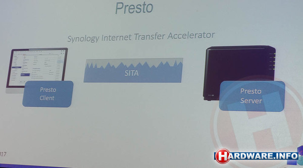Nieuw is ook Presto. Daarmee kun je gebruikmaken van het nieuw SITA-protocol (Synology Internet Transfer Accelerator). Dit is bedoeld om op afstand op een efficiënte manier bestanden via het internet van of naar de NAS te halen of te brengen. Het slimme protocol is aanmerkelijk sneller dan TCP, dat gewoonlijk voor dergelijk transport wordt gebruikt. De techniek is ook veilig vanwege de mogelijkheid om het protocol te voorzien van AES-encryptie.