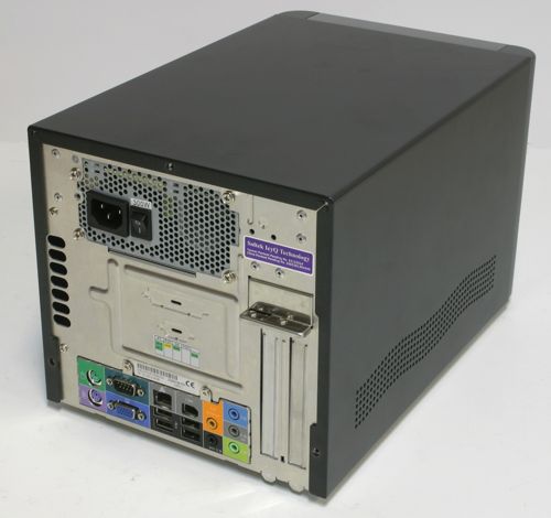 Ook aan de achterzijde vinden we volop audioaansluitingen, echter wel van het analoge soort. Om de 7.1 kanaals High Definition Audio Realtek ALC850 met de buitenwereld te verbinden zijn vijf analoge audioaansluitingen beschikbaar. Naast de audioaansluitingen heeft men ook ruimte gevonden voor een FireWire-, vier USB 2.0 en een gigabit Ethernetaansluiting. De achterzijde is verder nog gevuld met twee PS/2-aansluitingen en omdat dit systeem gebaseerd is op een Intel 915G chipset met ingebouwde GMA900 grafische mogelijkheden is er ook nog een VGA-aansluiting beschikbaar. Er is zelfs nog een ouderwetse seriële poort aanwezig.