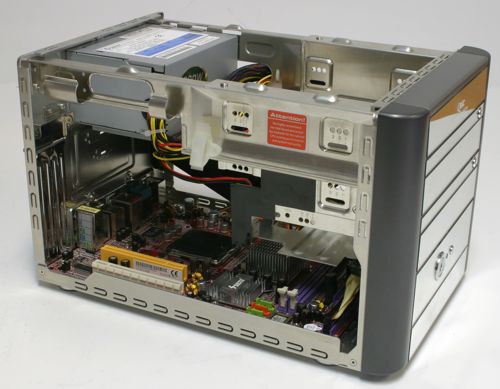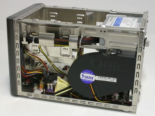 Doordat de Soltek Qbic net even een slag groter is dan andere cubes heb je voldoende ruimte om de binnenzijde te vullen met onderdelen. Het compacte moederbordje biedt veel aansluitingen, zo tellen we in totaal vier Serial ATA 150 aansluitingen, maar slechts 1 Parallel ATA-aansluiting, ook een aansluiting voor een diskette drive is nog aanwezig. Aan de achterzijde zijn de uitbreidingsslots voor PCI en PCI-Express x16 te vinden. De laatste is aan de buitenzijde geplaatst, waardoor de grafische kaart het meest kan profiteren van de koellucht. Helaas zijn er in de kap alleen aan de onderzijde gaten gemaakt voor het aanzuigen van koele lucht.
