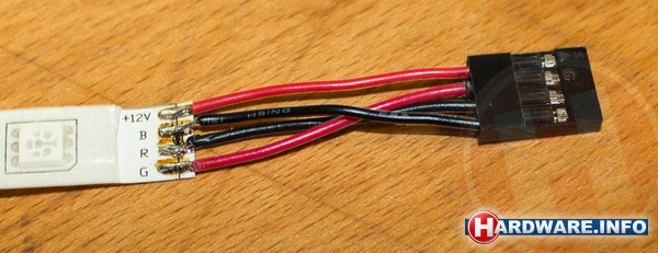 Let er hierbij op dat je de tweede en de vierde pin omdraait: de standaard volgorde op strips is +12V-B-R-G, terwijl de header op het moederbord de volgende pinvolgorde heeft: +12V-G-R-B. Je kunt de led-strip hiervoor doorknippen op de punten waar de vier koperen lijnen zichtbaar zijn – doorgaans is dit om de drie leds het geval. In het geval van een waterdichte led-strip zul je ook nog een stukje van de plastic bescherming moeten strippen. Je kunt hete lijm gebruiken om de banen na het soldeerwerk weer af te dekken.