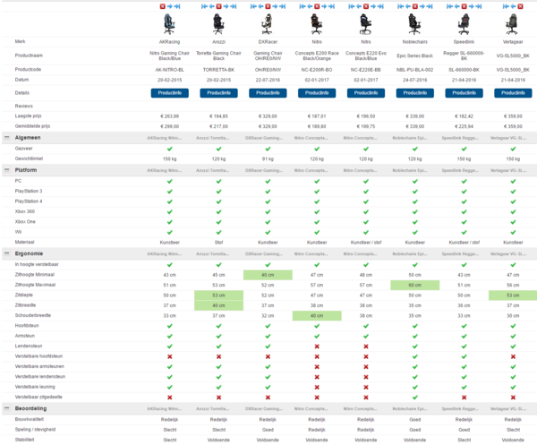 In de tabel hieronder vind je de specificaties van de gestest stoelen, evenals ons oordeel op het gebied van bouwkwaliteit, speling/stevigheid en stabiliteit. Klik op de tabel voor een grotere versie.