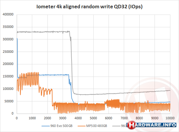 In de bovenstaande grafiek hebben we de prestaties in de consistentietest van de Samsung 960 Evo, 960 Pro en Corsair Force MP500 tegenover elkaar gezet. Wat daarbij opvalt is dat de snelheid erg blijft fluctueren, ook als het steady-state prestatieniveau eenmaal is bereikt.