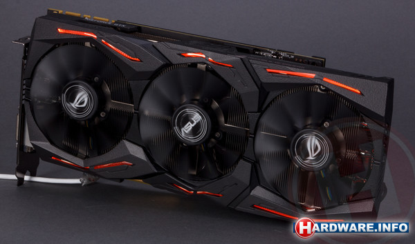 We kunnen natuurlijk geen ASUS-videokaart bespreken zonder aandacht te besteden aan de rgb-verlichting. Op de voorkant van de koeler zijn leds aangebracht, maar ook achterop de backplate vinden we nog een verlicht ROG-logo. Via de software kun je kiezen uit verschillende effecten en kleuren. Bovendien kun je de verlichting synchroniseren met die van andere componenten, zoals een moederbord, en ondersteunde randapparatuur van diverse fabrikanten. Een complete lijst daarvan vind je hier.
