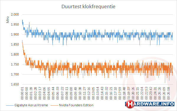 Als we de Aorus in één grafiek zetten met de Founders Edition, vertoont hij inderdaad ongeveer hetzelfde gedrag. Het verschil is echter dat de Founders Edition uiteindelijk 'stabiliseerde' rond de 1733 MHz, doet de Aorus Xtreme dat net iets onder de 1900 MHz. Dat is een verschil van bijna 10 procent.